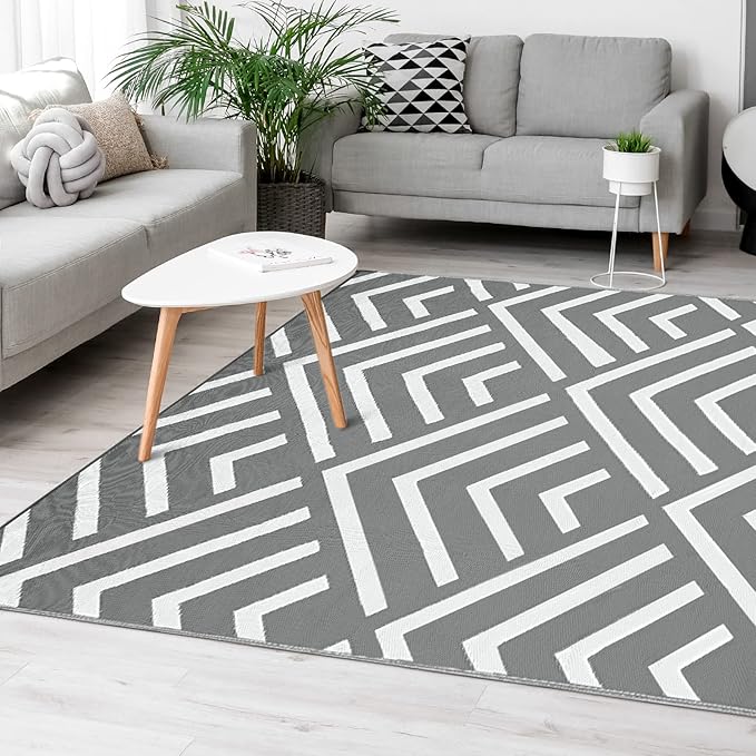 Kohree RV Outdoor Rug 9x12 Reversible, Waterproof Patio Mat with 4 Stakes & UV Fade Resistant, Non-Slip Outdoor Camping Mat for Deck, Picnic, Backyard, Includes Carry Bag (Grey & White)
