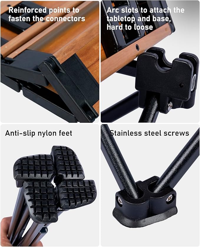 - Sturdy and ultralight, made of aerospace-grade aluminum alloy, only 3 lbs; Max Load 66 lbs; Unlike wooden or nylon-top tables, this table is durable, waterproof, corrosion-resistant, easy to clean; Sturdy joints and connectors, plus anti-slip rubber feet make this table more stable, and the legs won't fold, bend, or disengage on different terrain; Very easy to set up, just open the base frame and attach the table top, enjoy your leisure time in seconds, you can also check the video in this page to see more details