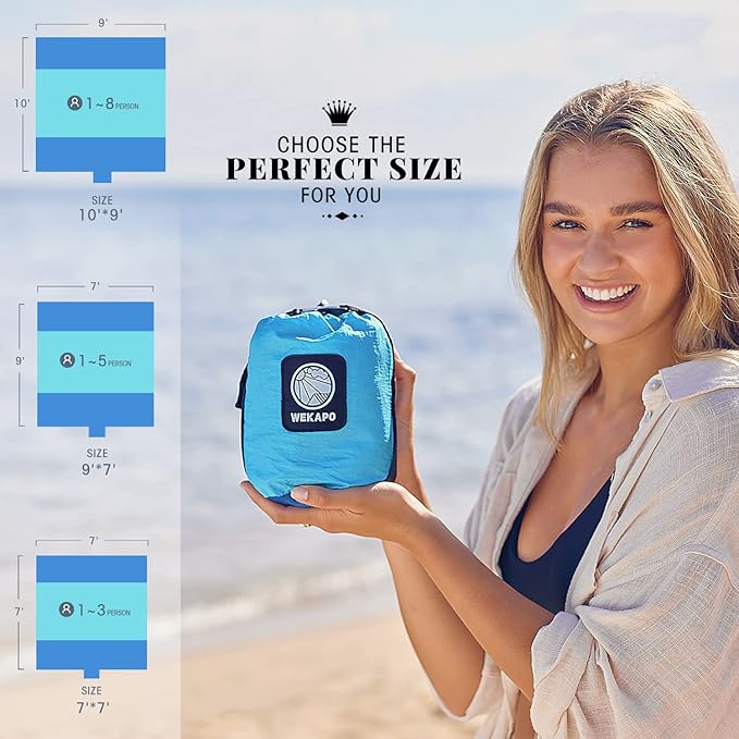 WEKAPO Beach Blanket Sandproof, Extra Large Beach Mat, Big & Compact Sand Free Mat Quick Drying, Lightweight & Durable with 6 Stakes & 4 Corner Pockets