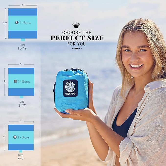 WEKAPO Beach Blanket Sandproof, Extra Large Beach Mat, Big & Compact Sand Free Mat Quick Drying, Lightweight & Durable with 6 Stakes & 4 Corner Pockets