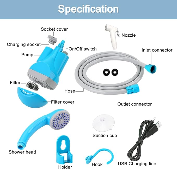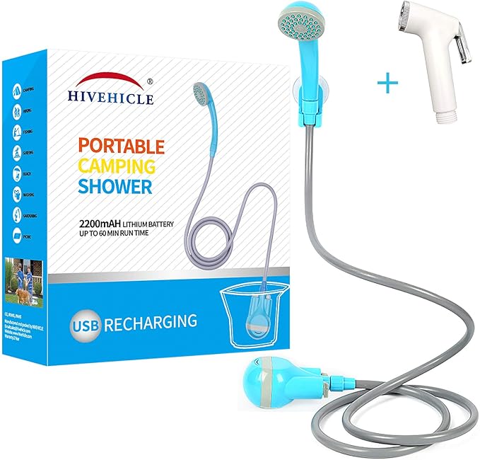 - ✅Multipe-uses Portable Shower:Our 2.0m long hose camping shower pump is equipped with rechargeable battery, which has been upgraded to 2200mAh and can be used for 35-45 minutes, which is enough to provide you with comfortable shower. Up to 3.5 L / min, you can use this powerful portable shower as an outdoor / indoor shower to clean your body, pet or car. It can also be used for camping, hiking, swimming, picnics, mountain climbing, etc.