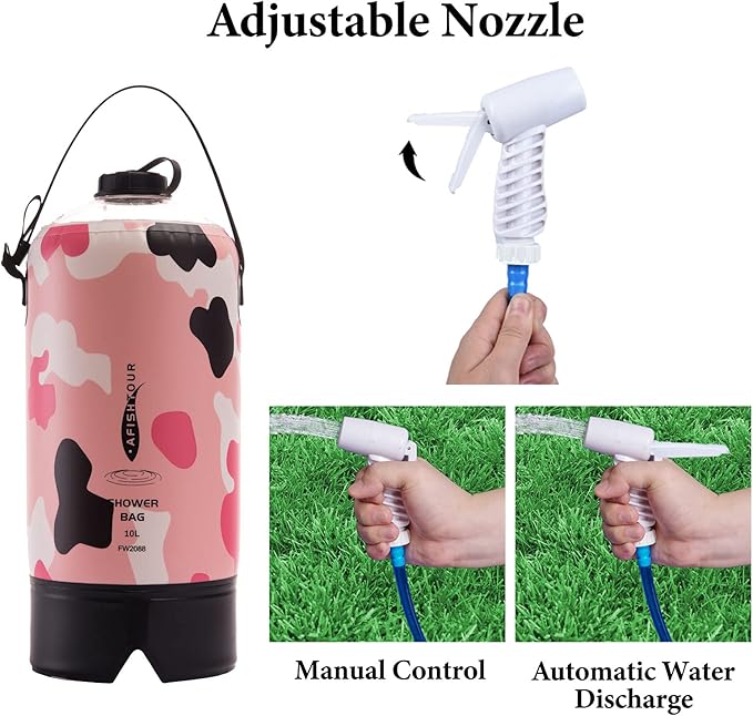 • ADJUSTABLE SHOWER HEAD: The camp shower is equipped with an adjustable spout switch on the shower head. This feature allows you to flip up the switch to keep the water flowing, freeing your hands while showering. It provides convenience and flexibility during use. Additionally, a one-way return valve prevents water from flowing back into the shower bag, ensuring water integrity.