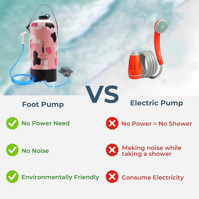 • PRESSURE FOOT PUMP: Compared with electric camping showers, you don't need to rely on electricity or batteries to operate the pump. This self-contained system allows you to have a shower whenever and wherever you need, without the need for external power sources. It gives you more freedom to enjoy outdoor adventures without being restricted by access to electricity.