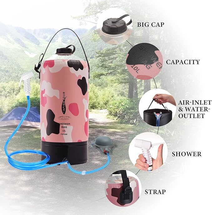 • EASY WATER FILLING: The shower bag features an enlarged water filling port, making it easy to fill the bag with water. The upgraded screw cap ensures a secure and leak-proof seal, preventing any water from spilling or leaking out during use.