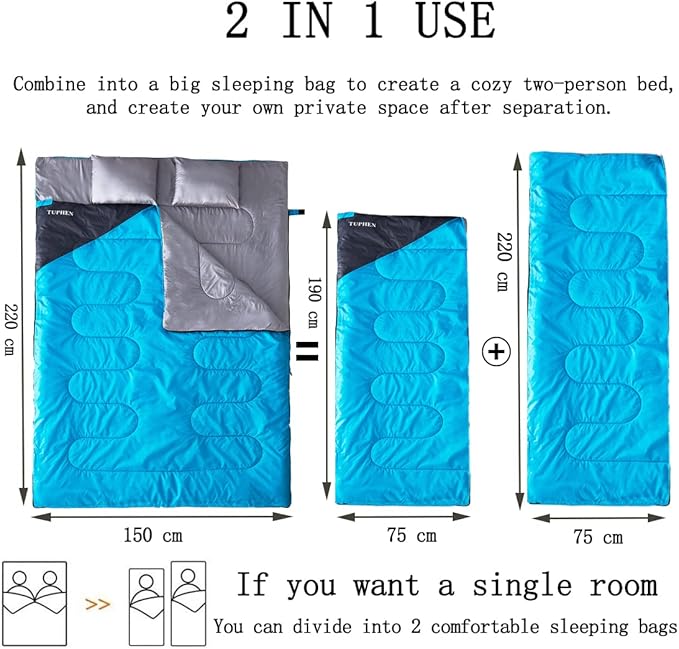 - Dual Usage: The double sleeping bag , which fits two happy campers comfortably, and can be disassembled by a zipper to become two independent sleeping bags.Imagine the memories you will leave with it.