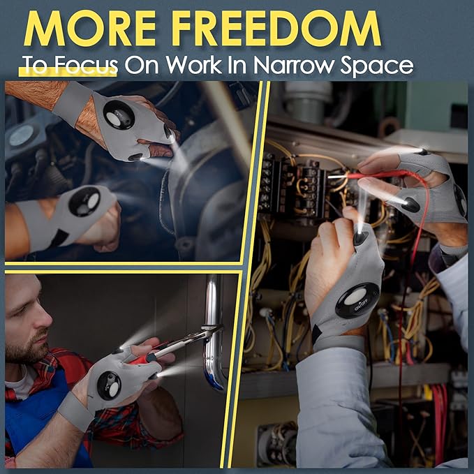 - Operate Your Task Easily. Cool Gadget for Handymen - The hands-free lights from the LED flashlight gloves conveniently point to where they're needed when you are working at dark tight place with both hands. The lighted gloves provide bright light without having to hold a flashlight. Gifts for dad to fish at dusk or repair the car; a must-have stuff for mom to sew or DIY small items; useful tools for husband to run & walk dogs. Definitely unique gifts & cool things for guys who have everything.