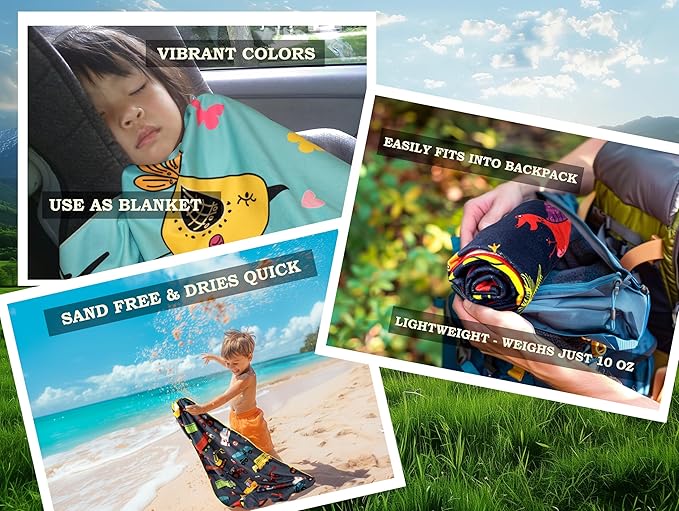 - WIDE USE - This is more than just a gorgeous beach bath towel and soft portable blanket. It is suitable for use at home, beach, pool, swimming, picnic, sleepover, travel, vacation, cruise, exercise, gym, fitness, camping, hiking, yoga, outdoor, water park, tennis, sports, sporting events, etc. It is a multi-purpose towel and a wonderful gift for little ones.