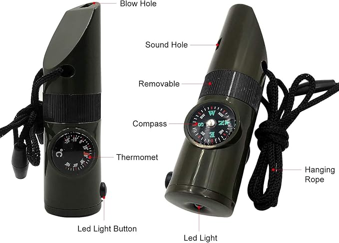 - Included Components : 2 emergency survival whistles, each with a compass, thermometer, mirror, magnifying glass, LED light, capsule, and nylon rope 2 emergency survival whistles, each with a compass, thermometer, mirror, magnifying glass, LED light, capsule, and nylon rope