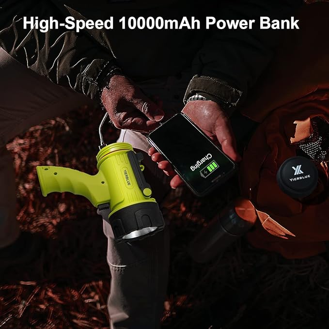 YIERBLUE Rechargeable Spotlight with 200000 Lumen LED, IP67 Waterproof Handheld Flashlight Searchlight with Detachable Red Light Filter, 24 Hours Long Running (fluorescent)
