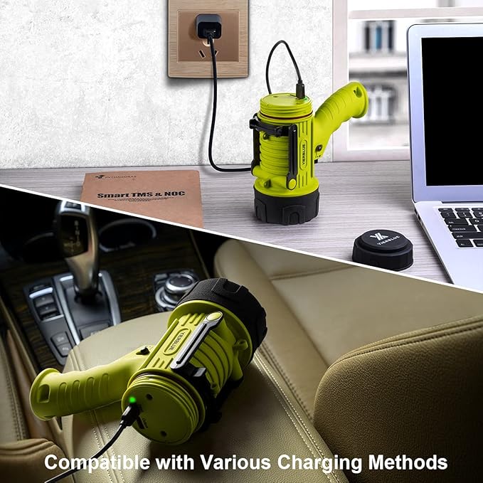 - A revolution about charging: Our spotlight flashlightabandon the original charging mode, Using the latest generation of USB-C charging technology, the charging time is shortened from 10 hours to 4 hours. Compatible with various charging methods, you can charge this high power flashlights at home or in your car (charging adapter is not included).