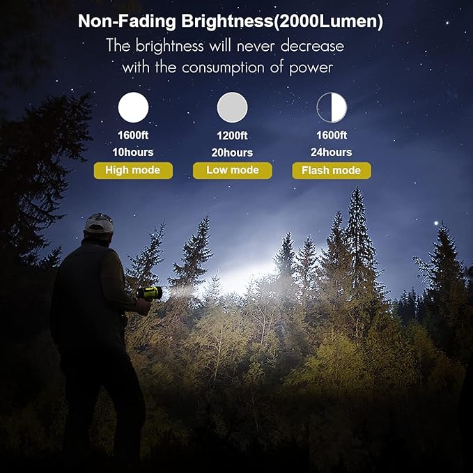 - A powerful heavy duty flashlight (Non-fading brightness): Super-bright 200000 lumen(max) LED light generates a brilliant focused spot beam, easily light up an entire backyard or focus in on objects up to 1000 feet away! Features 3 adaptable settings: High / Low / Flash(Long press the switch for 3 seconds). A dedicated integrated-circuit and intelligent illumination driver ensure consistent lighting everytime you turn on the LED spotlight.