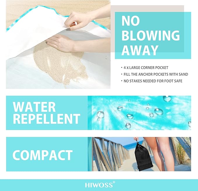 - 【SANDPROOF, WATER RESISTANT & SOFT】The beach blanket is made of sand resistant, waterproof fabrics. Just shake the blanket and it easily gets rid of all the sand once.Sand does not filter through. The Silky Soft Fabric let you lie comfortably while enjoying a pleasant day on the beach.