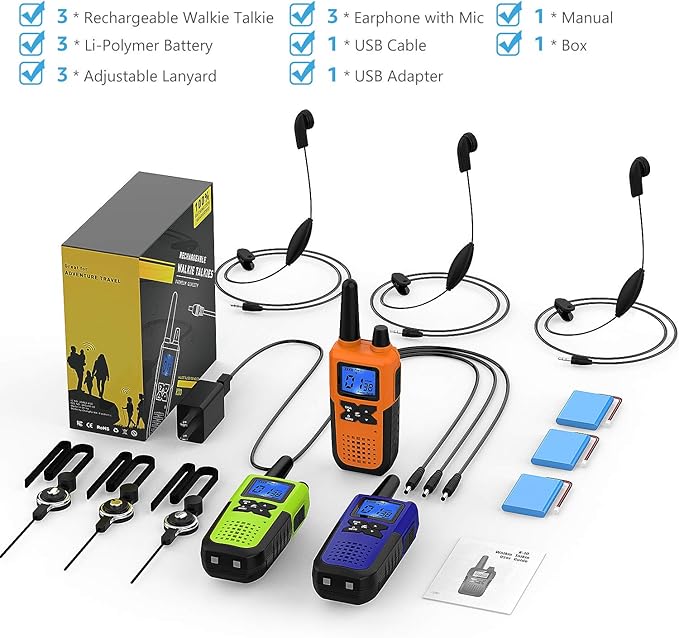 - 【Complete Set for Instant Use】 : Unbox to find everything you need: rugged walkie talkies for all ages, original earpiece and mic sets for private chats, original USB charger for rapid charging, Y cable for simultaneous charging, high-capacity battery for extended communication time, belt clip and adjustable lanyards for ease of carry. Your one-stop communication solution is here, whether for work, play, or anything in between