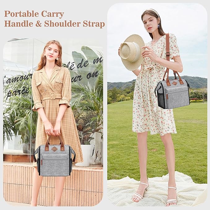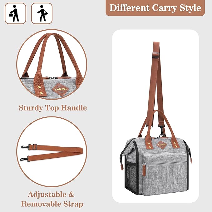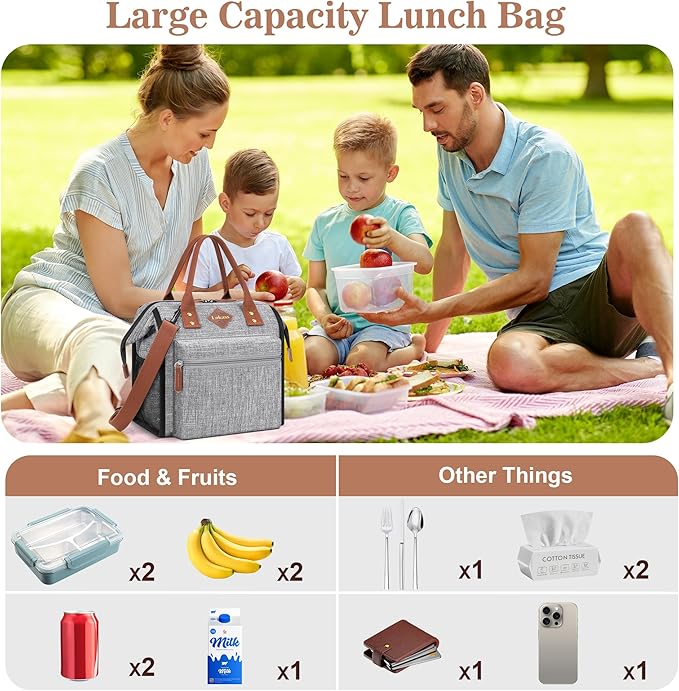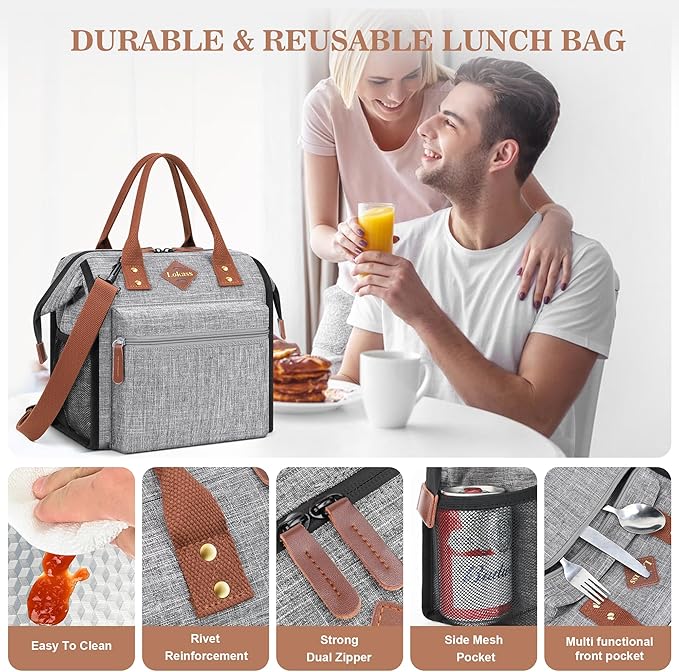 LOKASS Leak-proof Lunch Box for Women Insulated Lunch Cooler Bag Thermal Lunch Tote with Removable Shoulder Strap for Men Adults Large Picnic Bag for Office Work Outdoor, Grey
