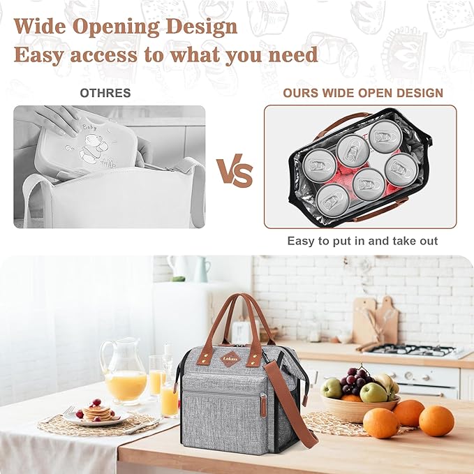- Wide-open Design - The top of lunch box can stay opening up to 10"L x 6"W, so you can be easy to see everything in the bag and your lunch containers can access HORIZONTALLY. No more leaking and soiling.