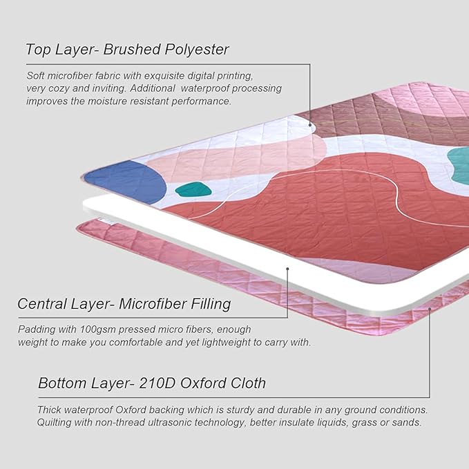 - THREE LAYERS: Made of multi-layers materials with ultra-sonic quilting technology. Soft brushed fabric on the top, padding with pressed microfibers, and sturdy 210D Oxford cloth as backing. Both the top and bottom are processed with waterproof finish,non-thread sewing further improves the moisture performance, and better insulates grass or sands. [Be Aware: No resistant to hot water!]