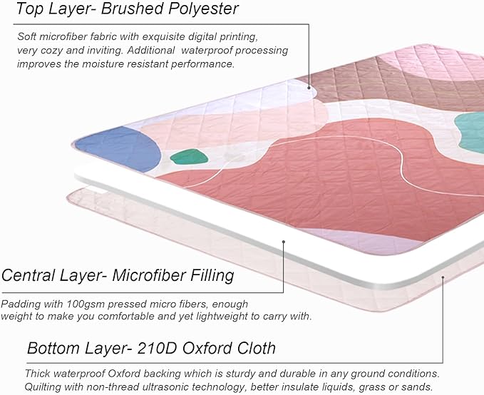• Three Layers: Made of multi layers materials with ultra sonic quilting technology. Soft brushed fabric on the top, padding with pressed microfibers, and sturdy 210D oxford cloth as backing. Both the top and bottom are processed with waterproof finish,non thread sewing further improves the moisture performance, and better insulates grass or sands