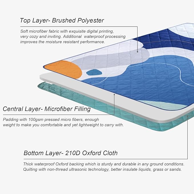 - THREE LAYERS: Made of multi-layers materials with ultra-sonic quilting technology. Soft brushed fabric on the top, padding with pressed microfibers, and sturdy 210D Oxford cloth as backing. Both the top and bottom are processed with waterproof finish,non-thread sewing further improves the moisture performance, and better insulates grass or sands. [Be Aware: No resistant to hot water!]