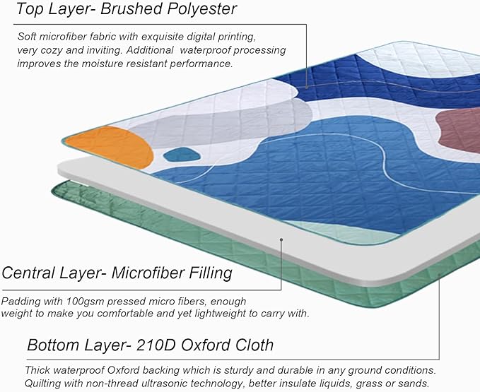 - Three Layers: Made of multi layers materials with ultra sonic quilting technology. Soft brushed fabric on the top, padding with pressed microfibers, and sturdy 210D oxford cloth as backing. Both the top and bottom are processed with waterproof finish,non thread sewing further improves the moisture performance, and better insulates grass or sands