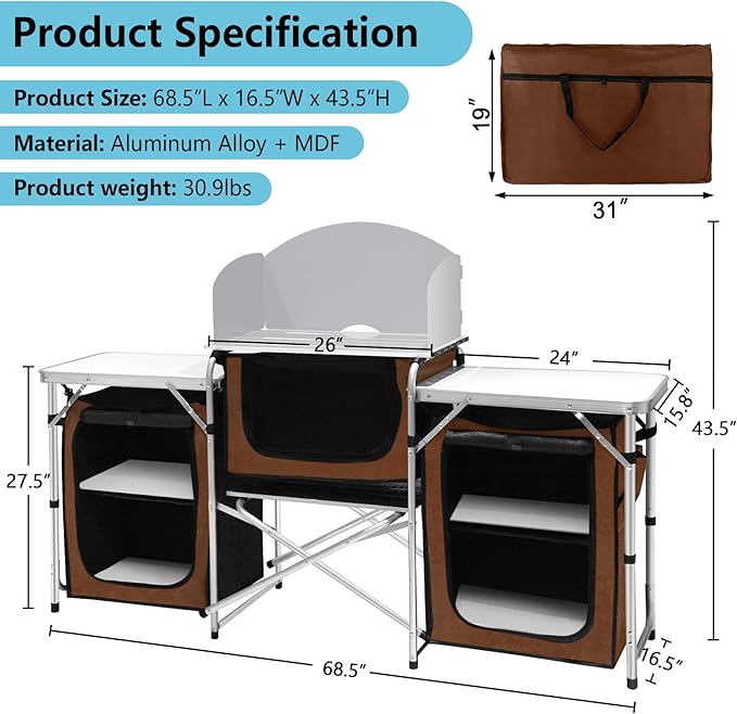 - 【Easy-operate and Portable】This camping kitchen with the detachable and foldable design for easy operate and use. We attach the installation manual in the package for assembles. All the parts are packed in the zipper bag which is 31" x 19" for convenient portability.