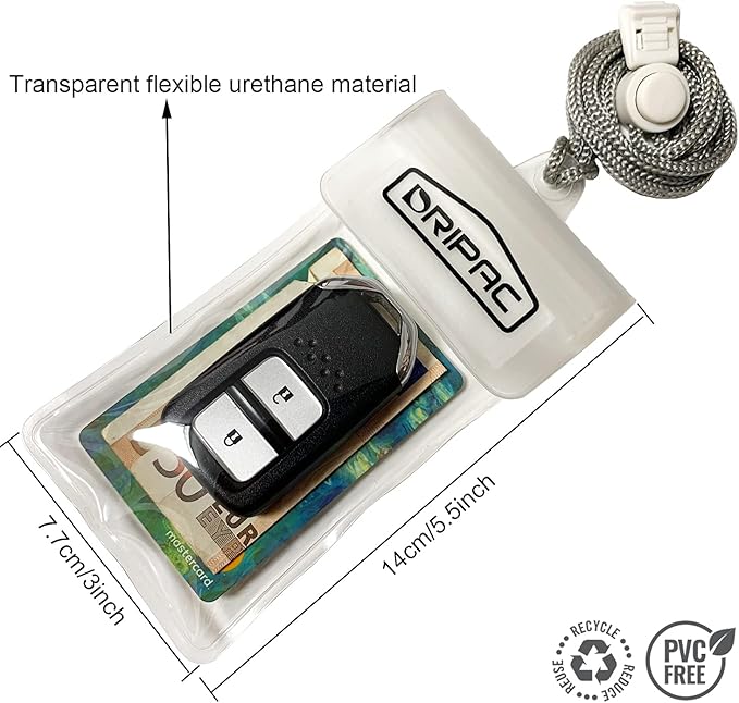 - 1. IPX8 grade 100% Waterproof up to 10M Design. DRIPAC Floating waterproof key Holder can protect all major car electronic key fobs,ID, cash, credit cards,Airtags, medication etc other small items from water, sand, dirt, scratch,old.