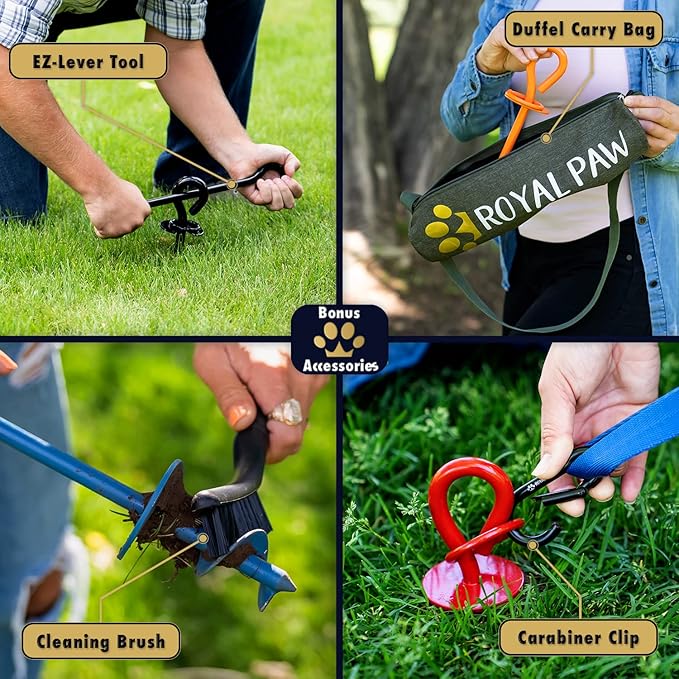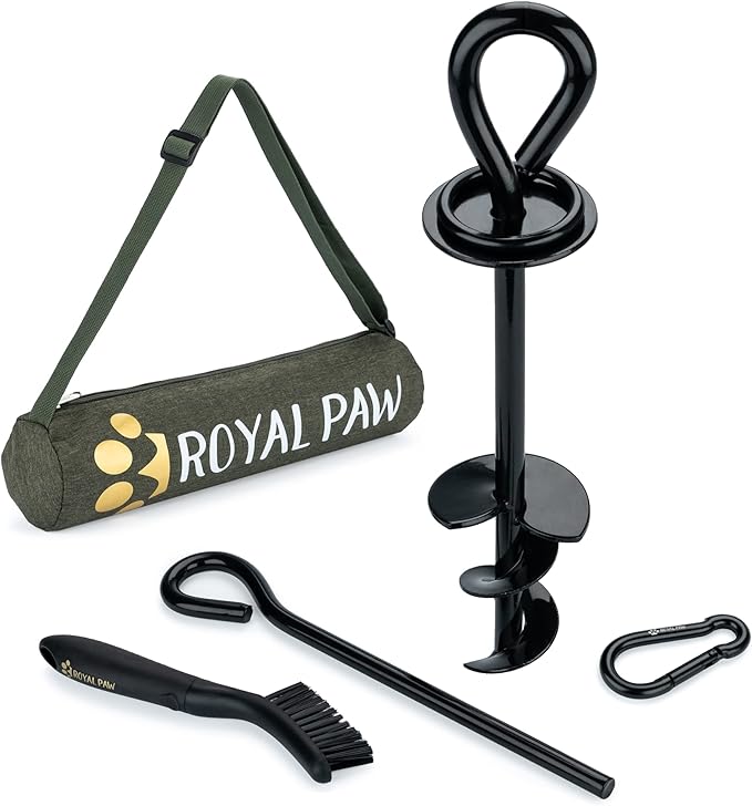 - [FREEDOM AT LAST!] A heavy duty dog stake made for active dogs of any breed size up to 125 lbs. Your on-the-go kit comes with your own cleaning brush, leash clip, install tool, and carry bag!