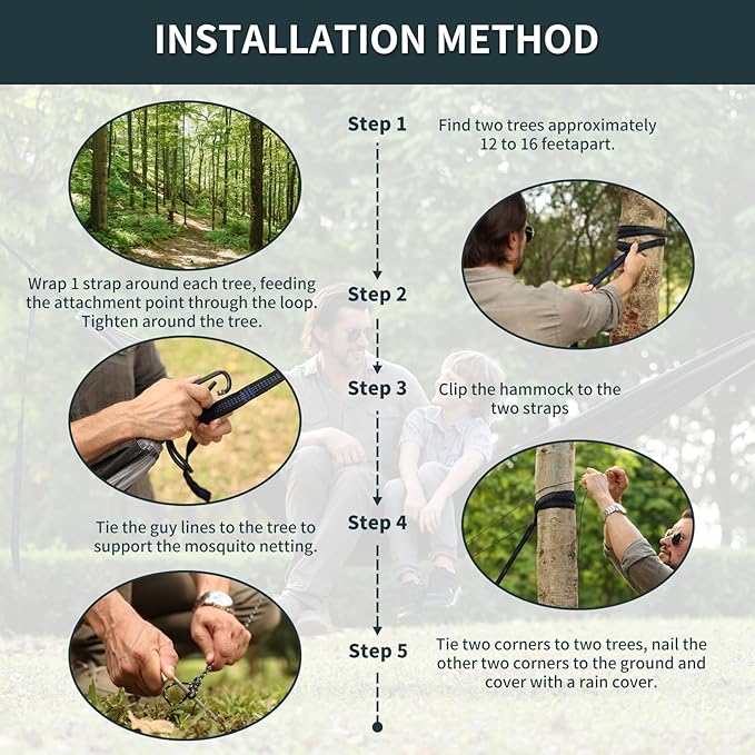 • 【EASY TO INSTALL】: Single hammock size is 114 x 57 inch. Can be folded into the small attached sack. The bundled bag dimensions size only 9 x 5 inch and weighted as 2.5 lbs, making it portable. You can adjust hiking hammock to the perfect height with tree straps, wrap and tighten the straps around the trees and get to relaxing in just one minute