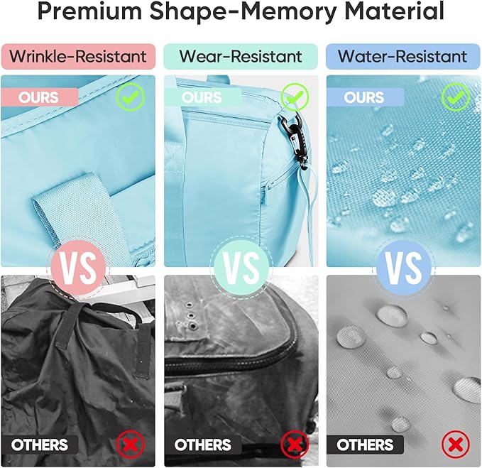 - [LIGHTWEIGHT & WATER PROOF DUFFLE BAG] Our duffle bags are made with 302T Twill Fabric. They are soft, washable, waterproof, wrinkle-free, and wear-resistant. Waterproof exterior keeps your clothes and items dry; it can be used both indoor and outdoor. Duffelbag with handles, and removable shoulder strap with adjustable buckle.