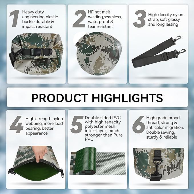 • Floatable and Trackable: The dry sack can float on water without sinking after being rolled up and buckled, so you can quickly track and retrieve your stuff. The D-ring and strap on the bag make it easy to attach to the boat, keeping your stuff always with you without getting lost, allowing you to enjoy thrilling outdoor activities with peace of mind.