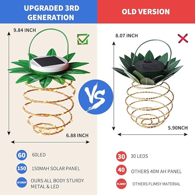 - [UNIQUE 2020 UPGRADED SOLAR PINEAPPLE LIGHTS] We have upgraded this solar lights in 2020: the number of led lights has increased from 30 leds to 60 leds; the brightness of led lights has increased by 60%. Ours updated rechargeable Pineapple Lantern can illuminate over 8 hours after charging 6-8 hours.(Charging and working time will change depending on the weather).