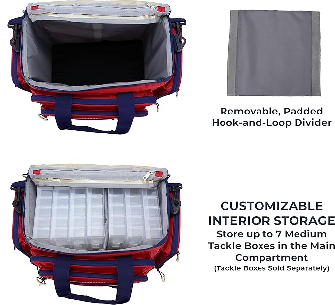 • CONVENIENT ORGANIZER - Customize the main compartment with a removable hook-and-loop divider. Store additional tackle in the clear interior pocket or in the 11 exterior rubber mesh and zippered pockets