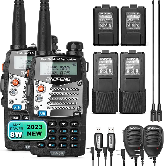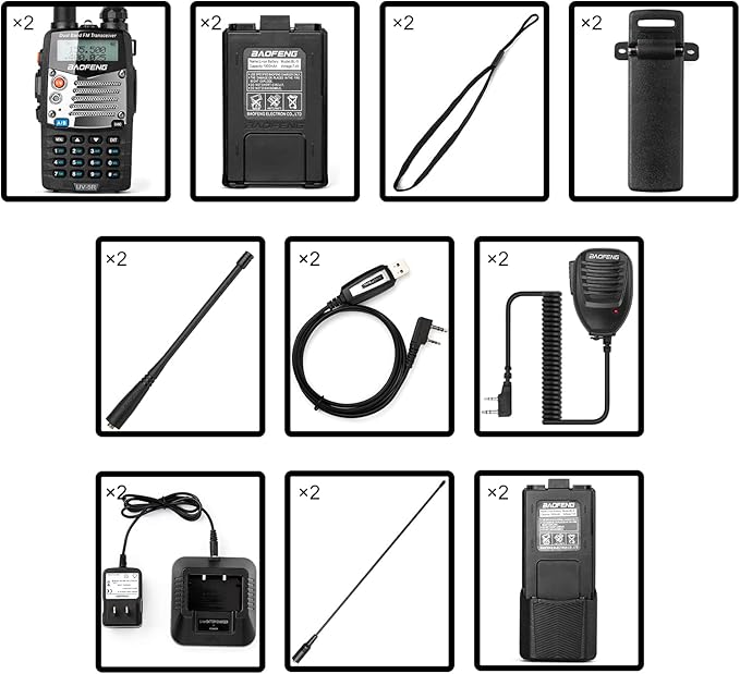 - Package includes: 2 × BaoFeng UV-5RM 8W Radio, 4 × Li-ion Battery, 2 × Programming Cable, 2 × RH-771 High Gain Antenna, 2 × Original Antenna, 2 × Hand Microphone, 2 × Power Adapter, 2 × Earpiece, 2 × Belt Clip, 2 × Hand Strap, 2 × User's manual