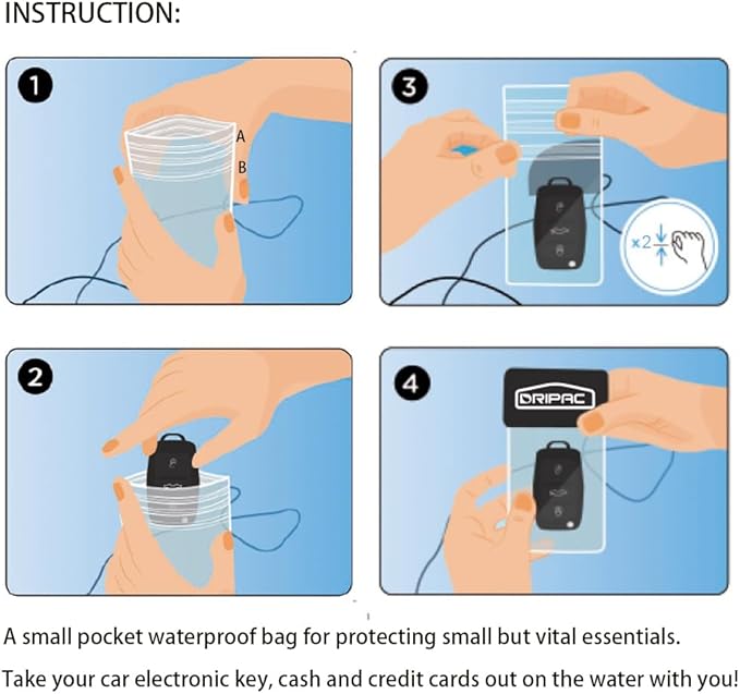 - 1. IPX8 grade 100% Waterproof up to 10M Design. DRIPAC Floating waterproof key Holder can protect all major car electronic key fobs,ID, cash, credit cards,Airtags, medication etc other small items from water, sand, dirt, scratch,old.