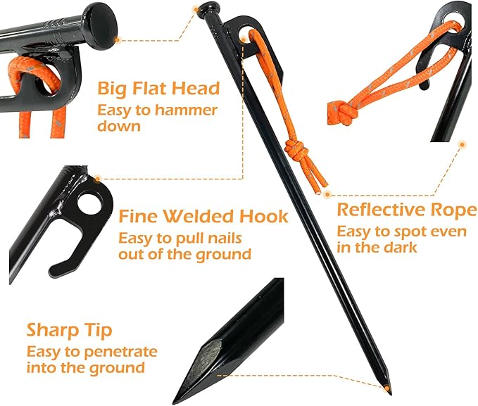 - Come with bright reflective pull cord, easy to spot and pull the pegs out.