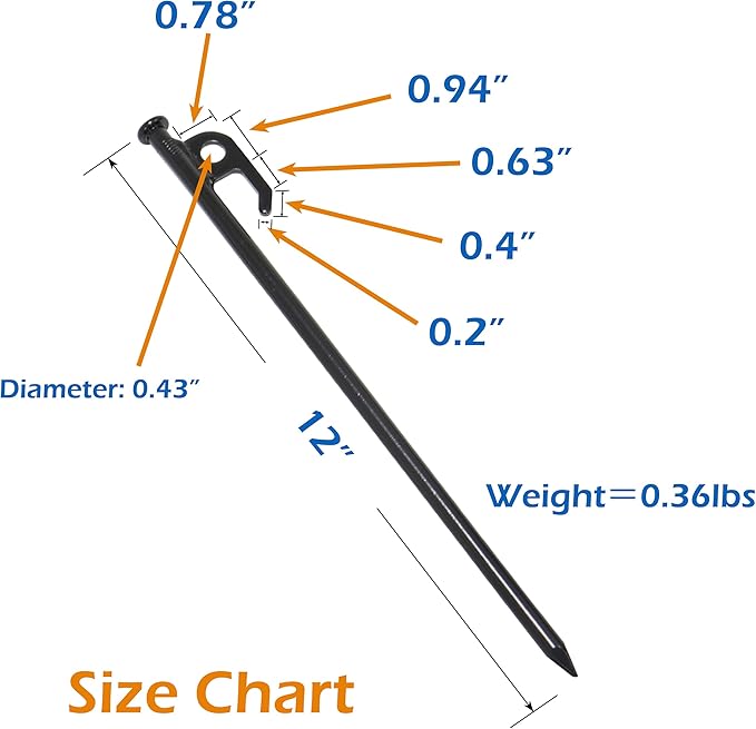 - 0.4" diameter steel rod with 12" overall length. 2.9lbs for 8 stakes.