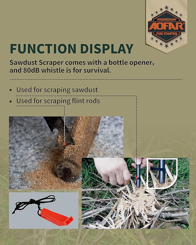 AOFAR Fire Starter, AF-376 Ferrocerium (Ferro) Rods, Fire Starter Kit with Two Multi-Tool Fire Strikers, 80dB Survival Whistle, Paracord Lanyard for Camping, Hiking, Emergency Rescue (1/2 * 5.1 Inch)