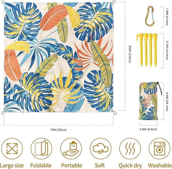 - 🌊Oversized But Compact: The 79"× 83" size beach / picnic blanket comfortably fit 4-6 adults sitting or 4 adults lying. It is the best choice for family and friends gathering. And it is easy to fold into a compact size(7.87"x3.93"), 0.73 lbs, so you can easily carry it for anywhere!