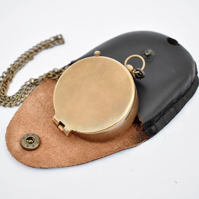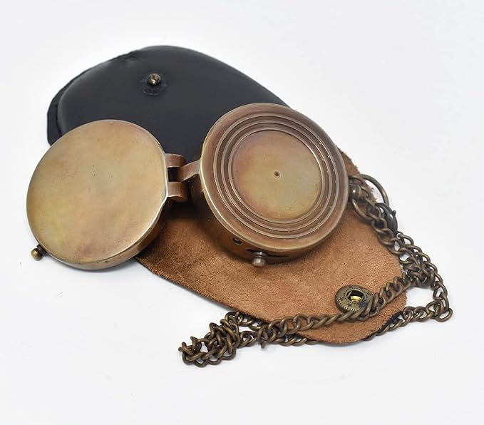 - 🧭 Fully Working Compass. SIZE : Compass: 2.5 x 2 x 0.8 inches. Material Used : Brass, Leather pouch and Brass Chain. Premium quality handcrafted brass compass and leather case.