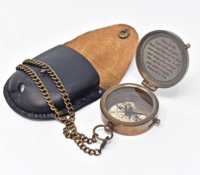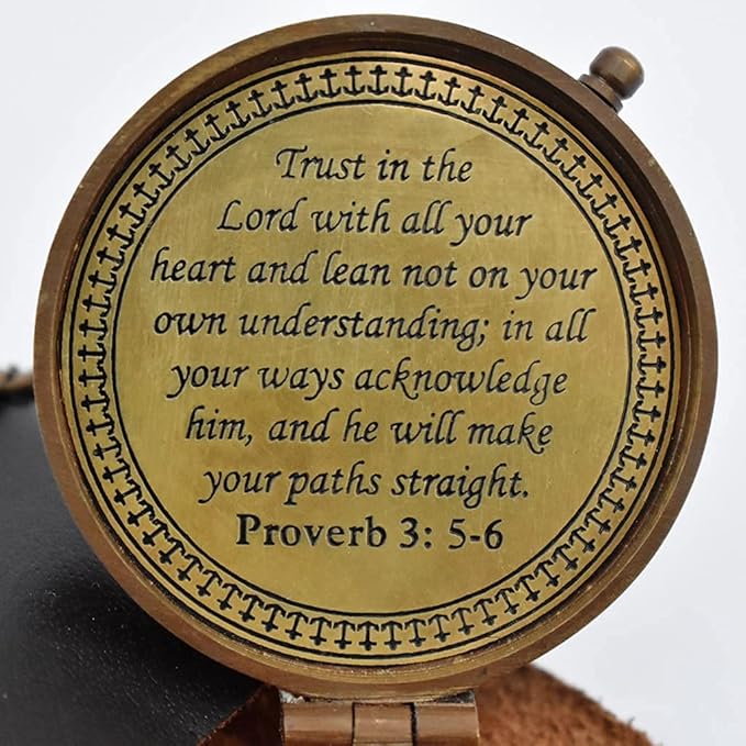 - 🧭 This Functioning Trust In The Lord Compass with antique finish include a Premium quality handcrafted brass compass and leather case. Proverbs 3: 5-16 engraved on Inner side of the compass.