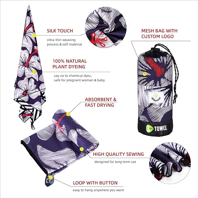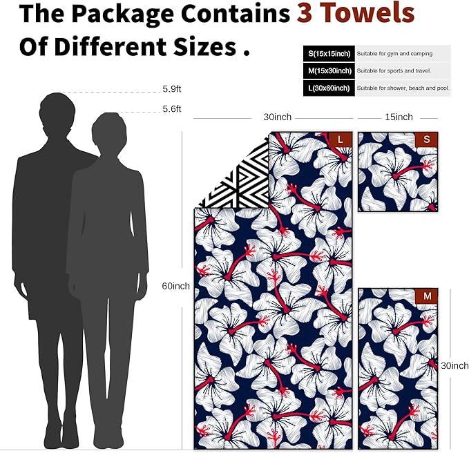 - 【3 Towels at 1 Pack】The package contains 3 towels of different sizes, (S:15''x15'') is a small hand towel and prefect for gym and yoga class,light and soft, absorb sweat quicker than you imagine.(M:30''x15'') is a prefect camping towel and you’ll find the size just designed for traveling.(L:60''x30''),the biggest towel in the package,the size is for shower,beach and pool,large yet light and portable.