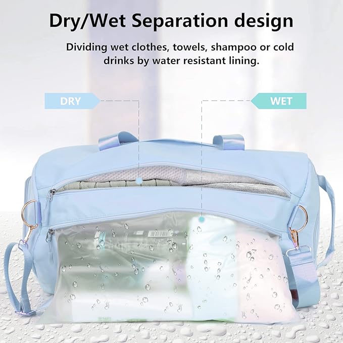 • DRY WET SEPERATED DESIGN & SHOE COMPARTMENT: The high density waterproof pocket can help you to divide wet clothes, towels, shampoo or cold drinks. Built-in shoe compartment keeps your shoe storage private and fresh. Additional storage pockets to organize your items and necessities.