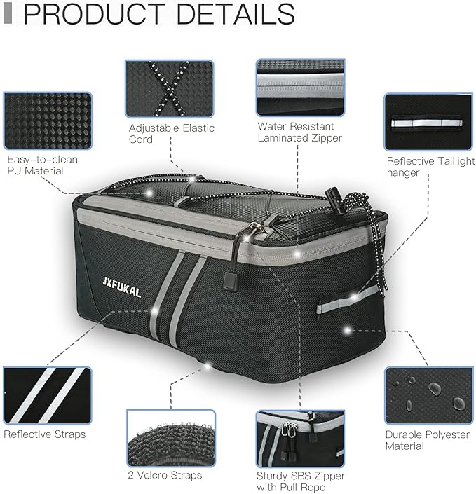 - WATER RESISTANT & STURDY: The bicycle rack bag is made of PU leather & polyester, which is durable, water repellent and easy to clean. It even comes with rain cover that completely helps protect the trunk and the stuffs in it from dirt, sand, water, rain and snow.