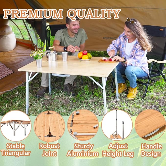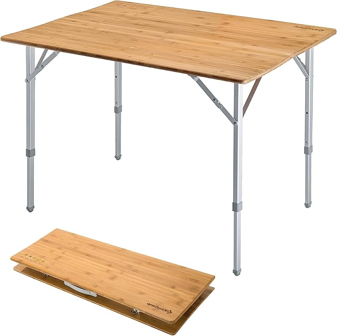 KingCamp Bamboo Folding Camping Table with Adjustable Height Aluminum Legs 2-Folds Portable Camp Tables for Travel, Picnic, 4-6 People
