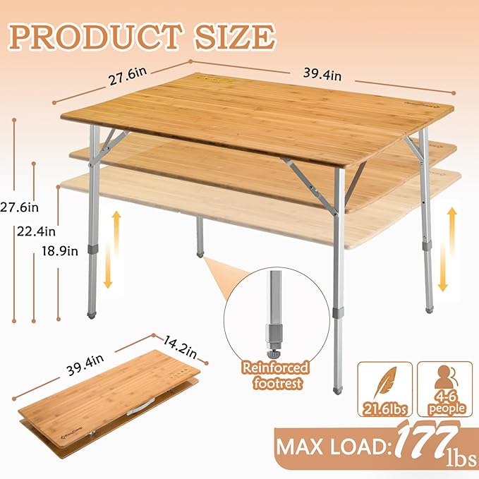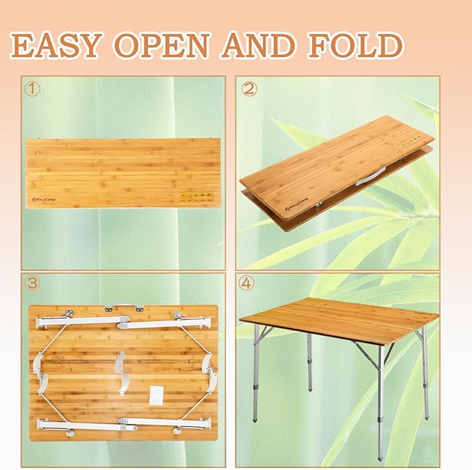 - 【EASY TO ASSEMBLE AND FOLD】No tools needed! It is easy to install. This camp table adopts a folding design, the bamboo tabletop and aluminum bracket can be folded in seconds to save space and be carried like a suitcase on a trip, and the table fits most car trunks to meet your camping needs.