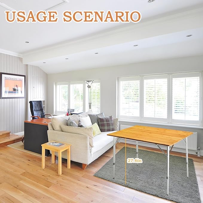 - 【FLEXIBLE ADJUSTABLE HEIGHT】From 18.9" to 27.6", the table legs can be adjusted to three heights, and each leg has a adjustment knob for easy leveling, you can use this foldable table at various occasions with different chairs.