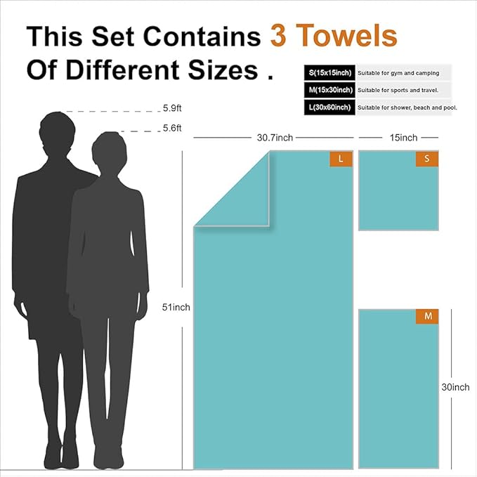 - 【3 Towels at 1 Pack】The package contains 3 towels of different sizes, (S:15''x15'') is a small hand towel and prefect for gym and yoga class,light and soft, absorb sweat quicker than you imagine.(M:30''x15'') is a prefect camping towel and you’ll find the size just designed for traveling.(L:60''x30''),the biggest towel in the package,the size is for shower,beach and pool,large yet light and portable.