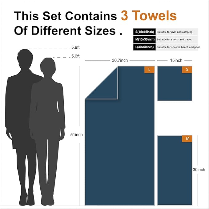 - 【3 Towels at 1 Pack】The package contains 3 towels of different sizes, (S:15''x15'') is a small hand towel and prefect for gym and yoga class,light and soft, absorb sweat quicker than you imagine.(M:30''x15'') is a prefect camping towel and you’ll find the size just designed for traveling.(L:60''x30''),the biggest towel in the package,the size is for shower,beach and pool,large yet light and portable.