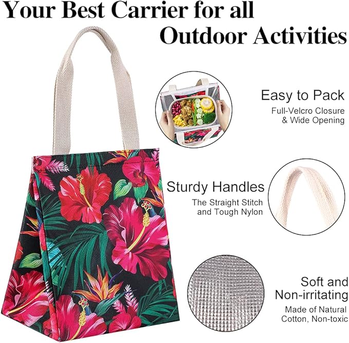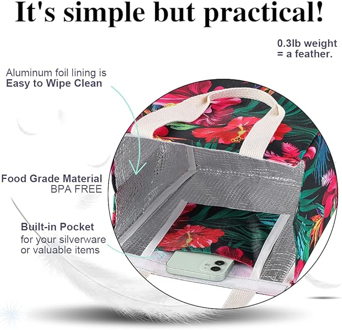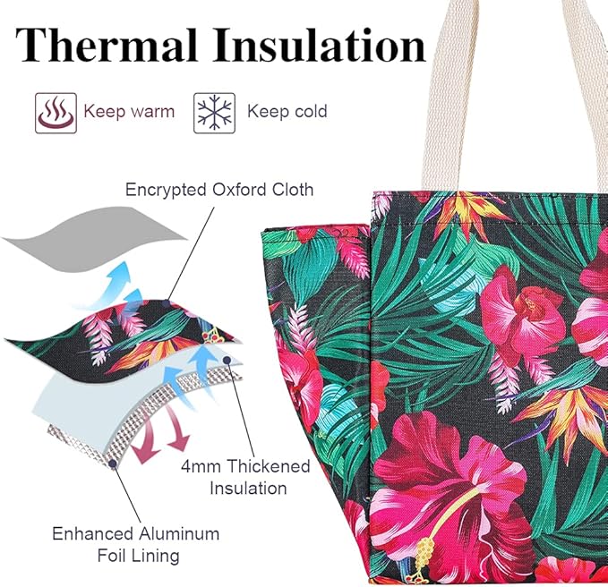 - INSULATED & FOOD-GRADE MATERIAL: The reusable lunch tote bags are constituted with oxford cloth and aluminum foil, which is known for its excellent air isolation and temperature retaining, keeping your food cold/warm for hours. Tight stitching without tearing, sturdy. Can Keeps your food warm or cold for hours well.
