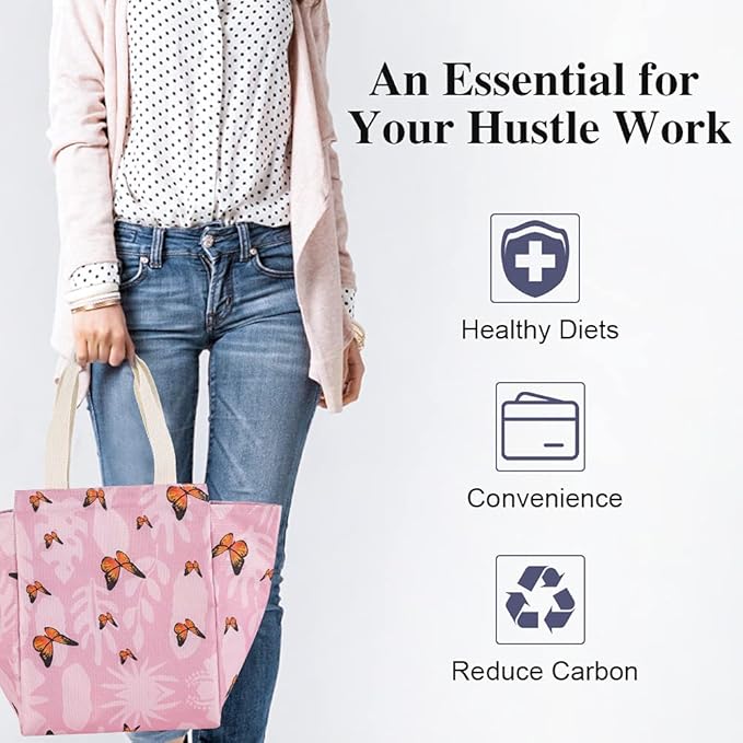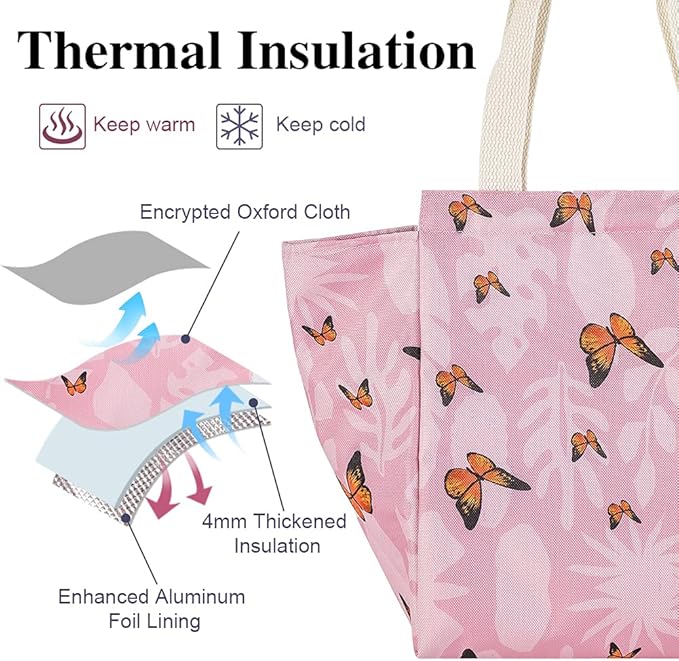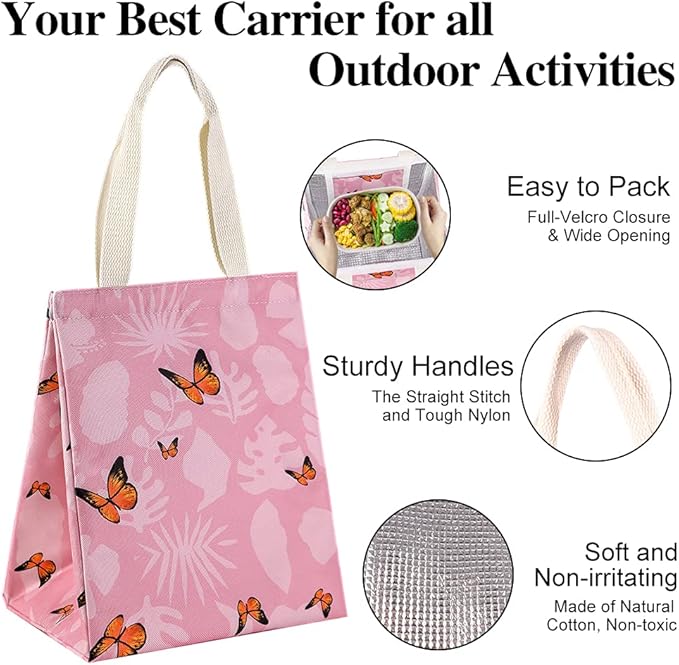 iknoe Insulated Lunch Bag for Women, 9L Sturdy Wide-Open Foldable & Portable Lunch Tote with Interior Pockets, Water-resistant Thermal Lunch Cooler for Adults Picnic Beach-Pink Butterfly