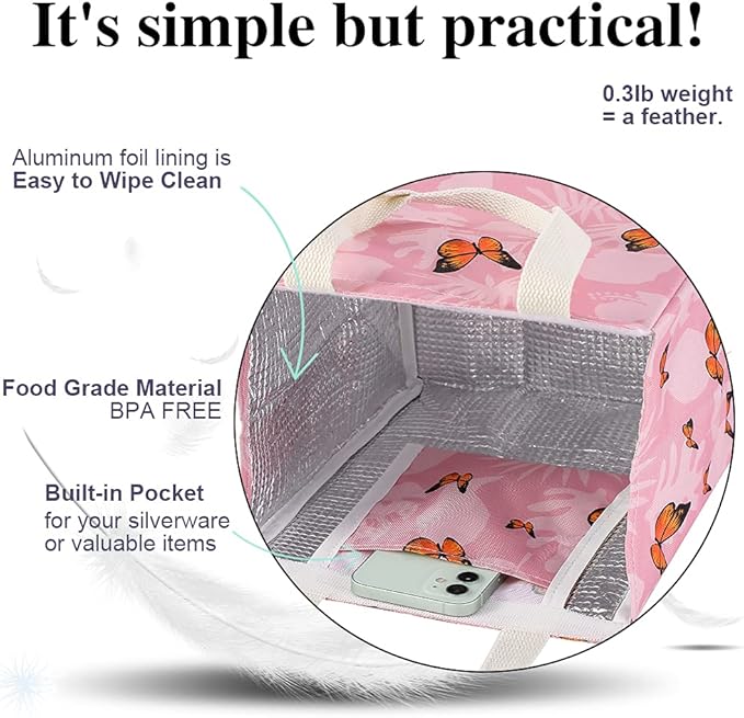 - ❤INSULATED & FOOD-GRADE MATERIAL: The reusable lunch tote bags are constituted with oxford cloth and aluminum foil, which is known for its excellent air isolation and temperature retaining, keeping your food cold/warm for hours. Tight stitching without tearing, sturdy. Can Keeps your food warm or cold for hours well.
